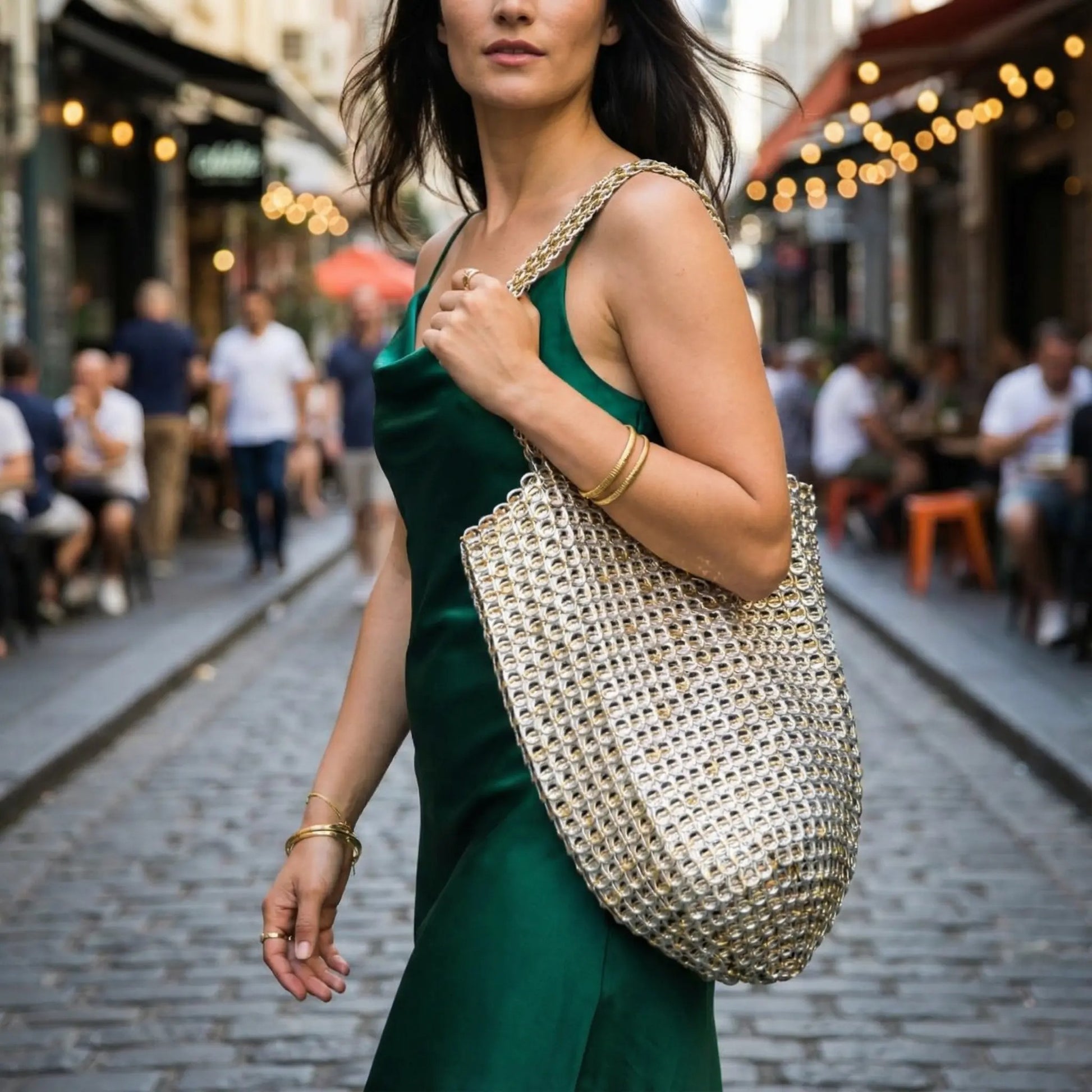 Hand-crocheted from individually polished recycled aluminium pull tabs, it has a smooth, flexible texture that feels soft against the body yet offers remarkable strength. Despite its airy feel, this tote confidently holds your everyday essentials and can even fit a laptop, making it both graceful and practical.