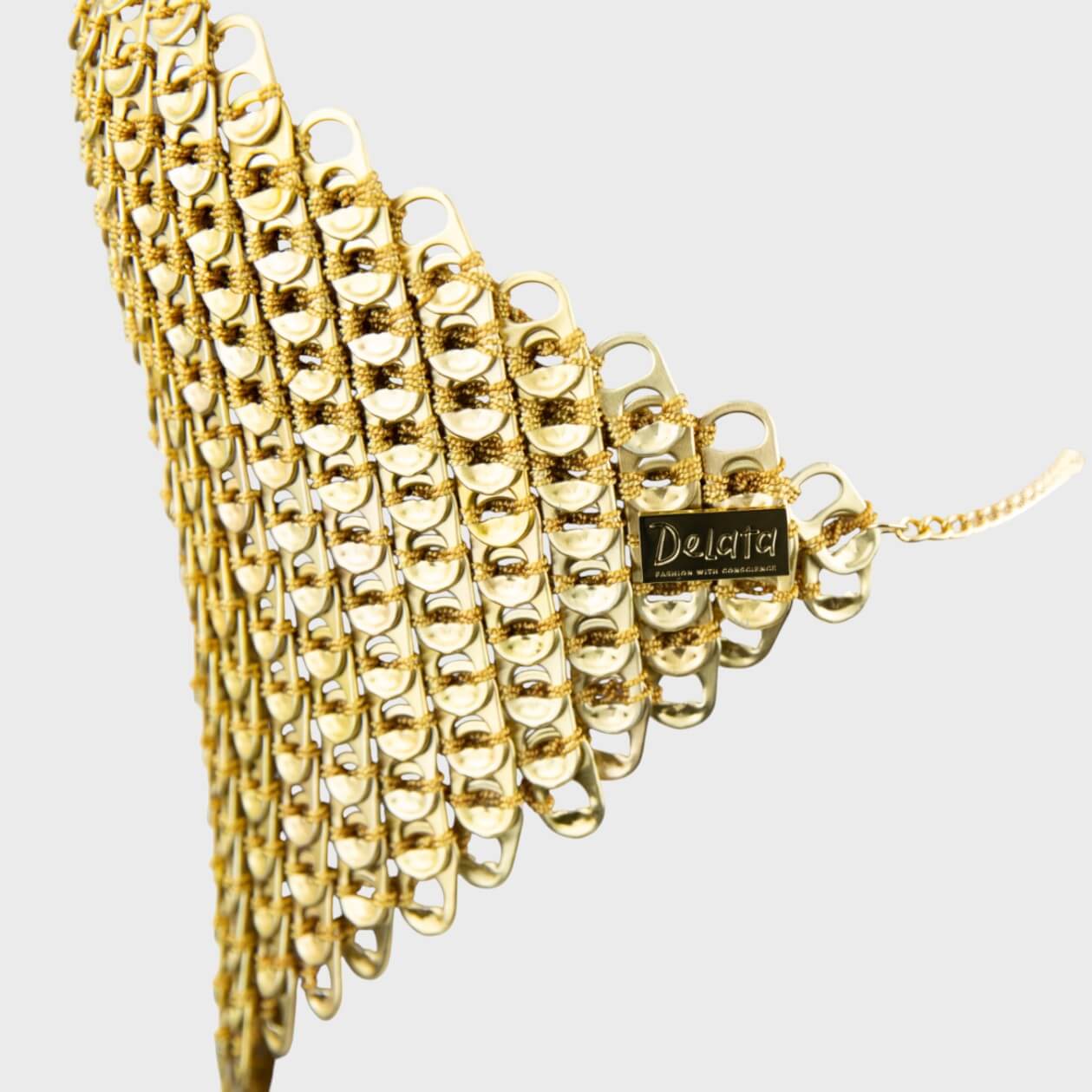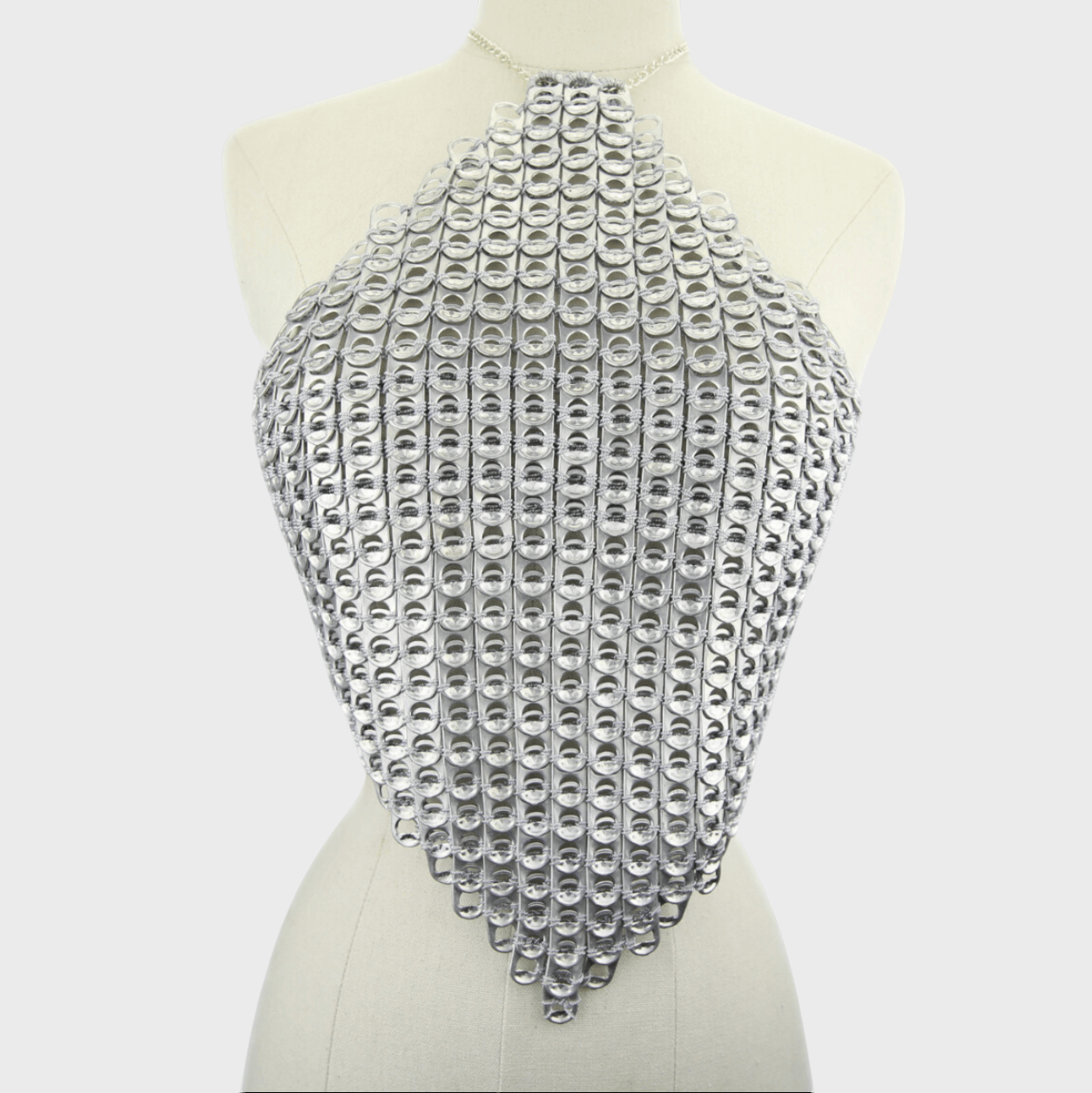 The Diamond Top is a bold statement piece handcrafted from recycled aluminium pull tabs that are cleaned, polished, and crocheted by our artisan mothers in Colombia. The diamond panel sits at the front and is held at the neck with an adjustable chain, while delicate side chains clasp at the centre back to create a glamorous open back.