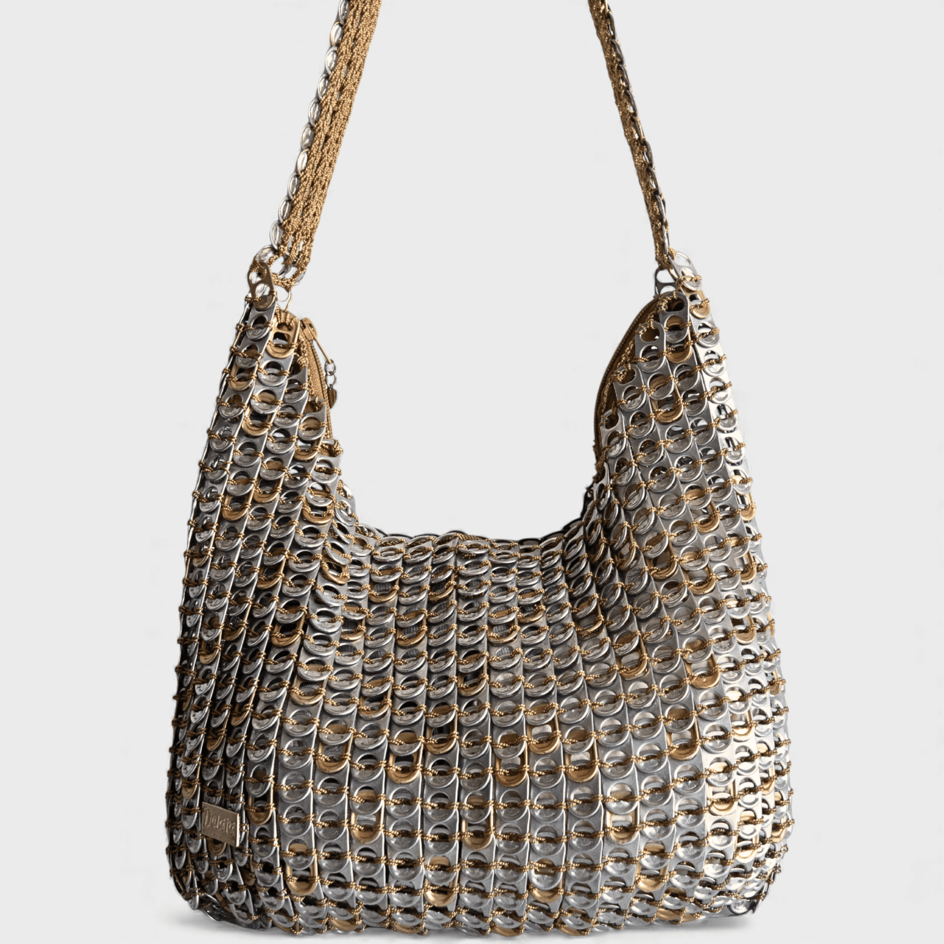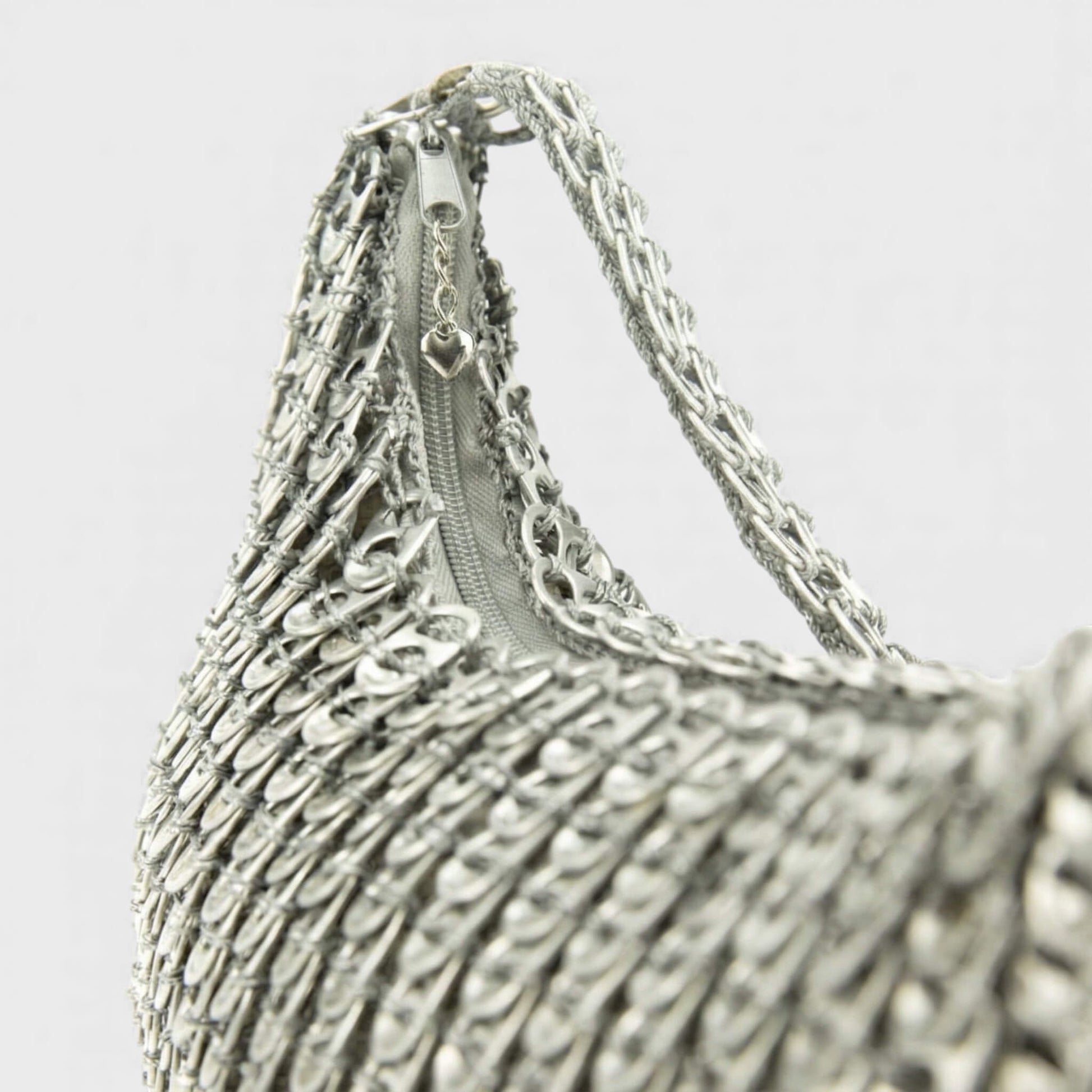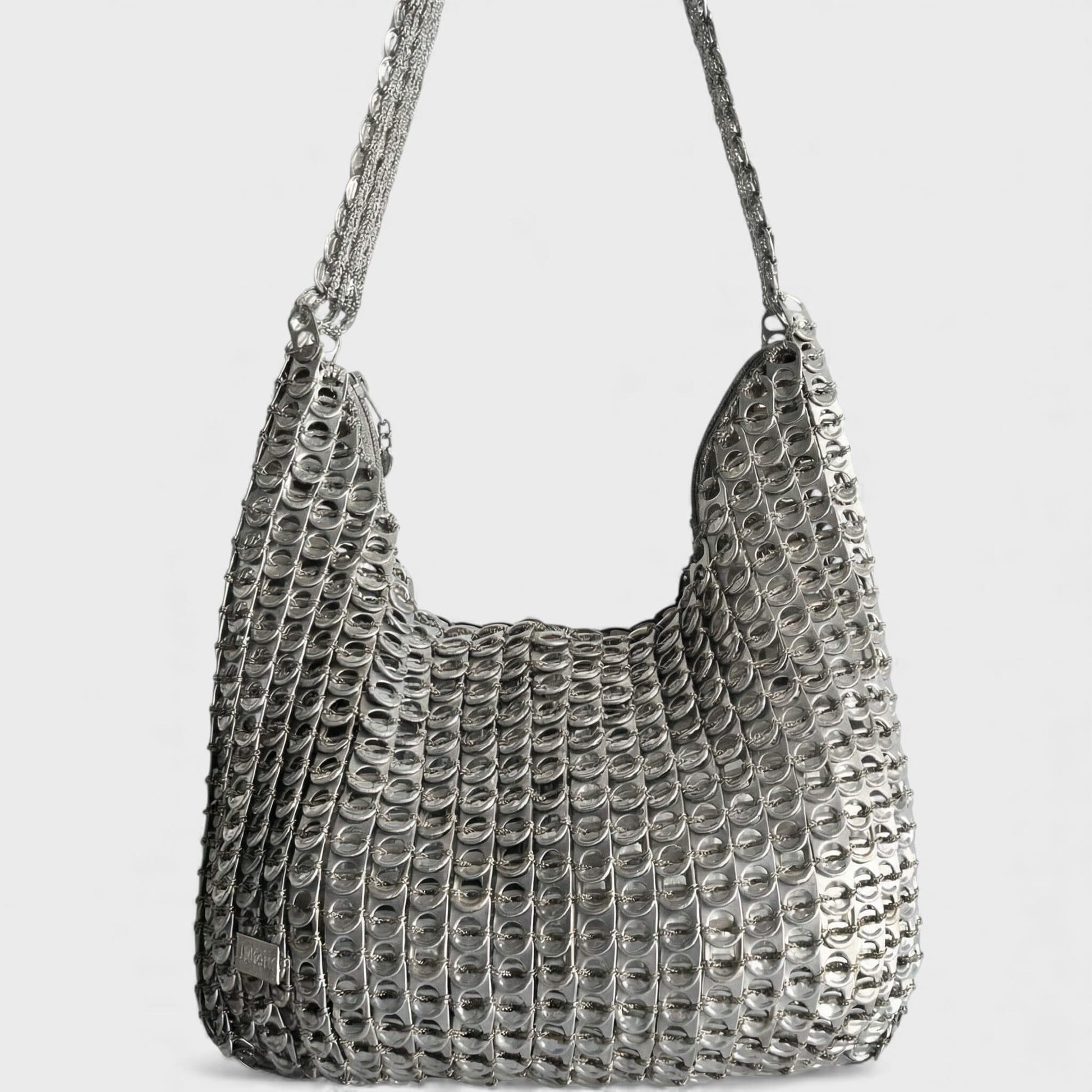 Handcrafted from individually polished recycled aluminium pull tabs, it has a smooth, fabric-like texture that moves with you and catches the light with a gentle sheen. Each piece is woven by skilled artisan mothers in Colombia who transform reclaimed materials into a refined and luminous surface.