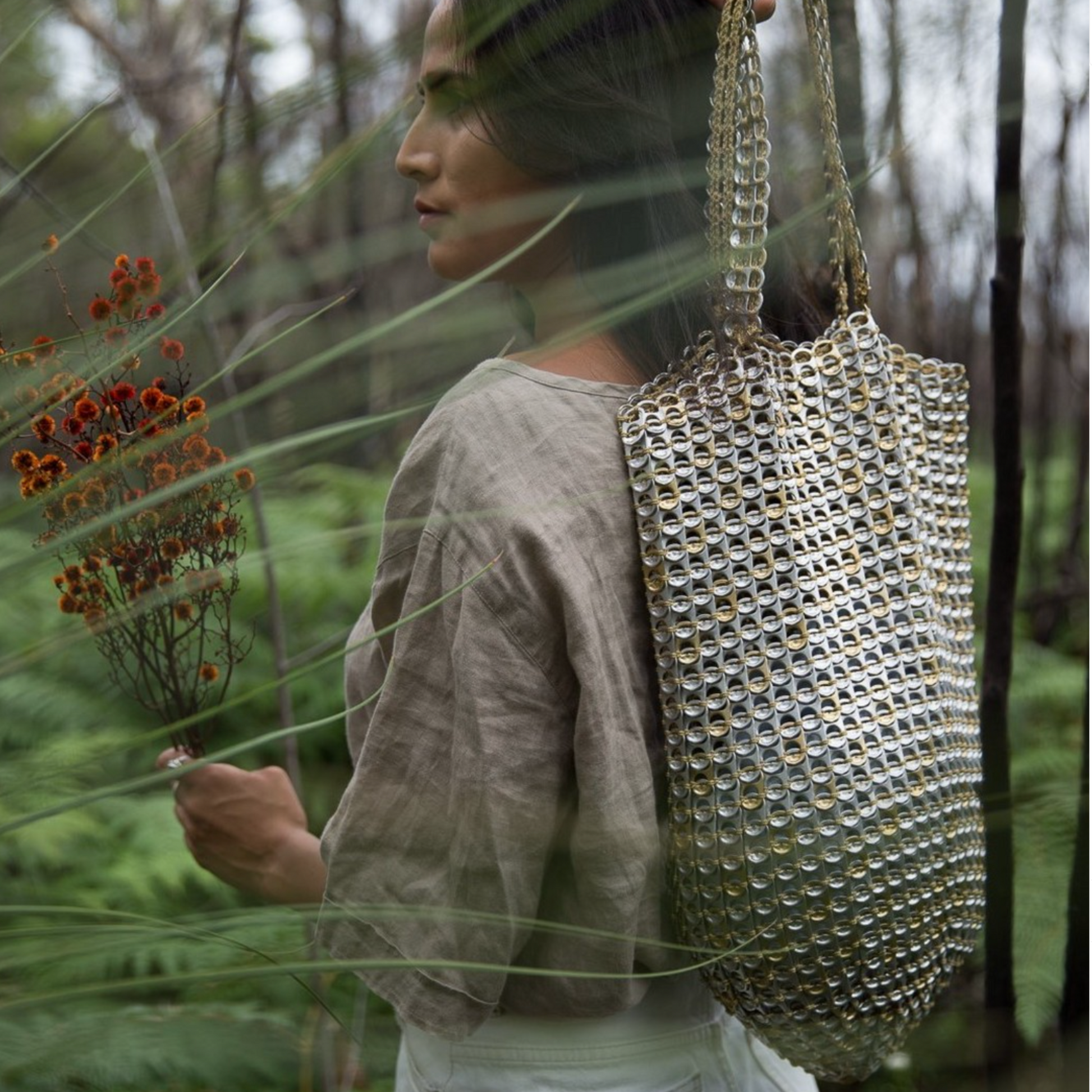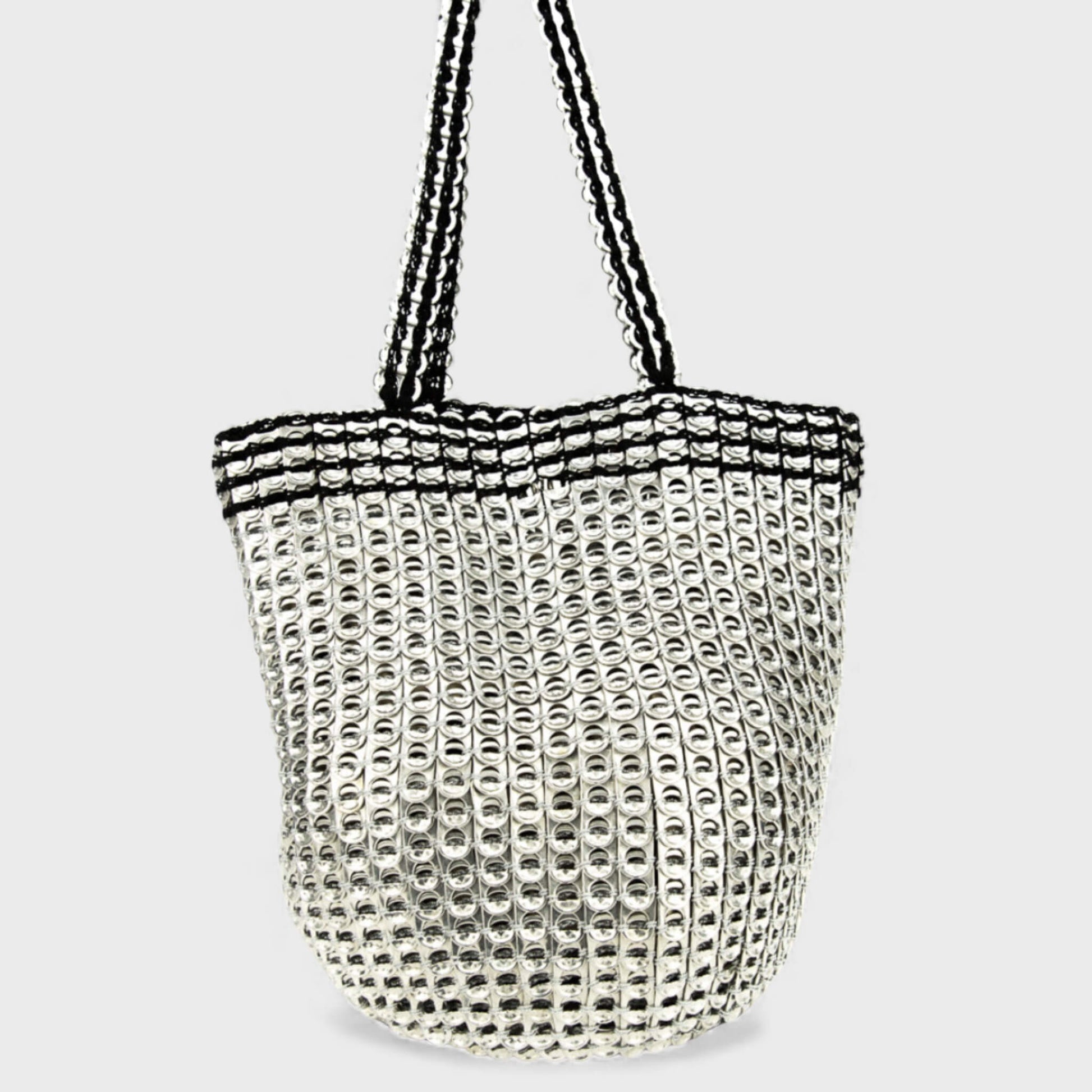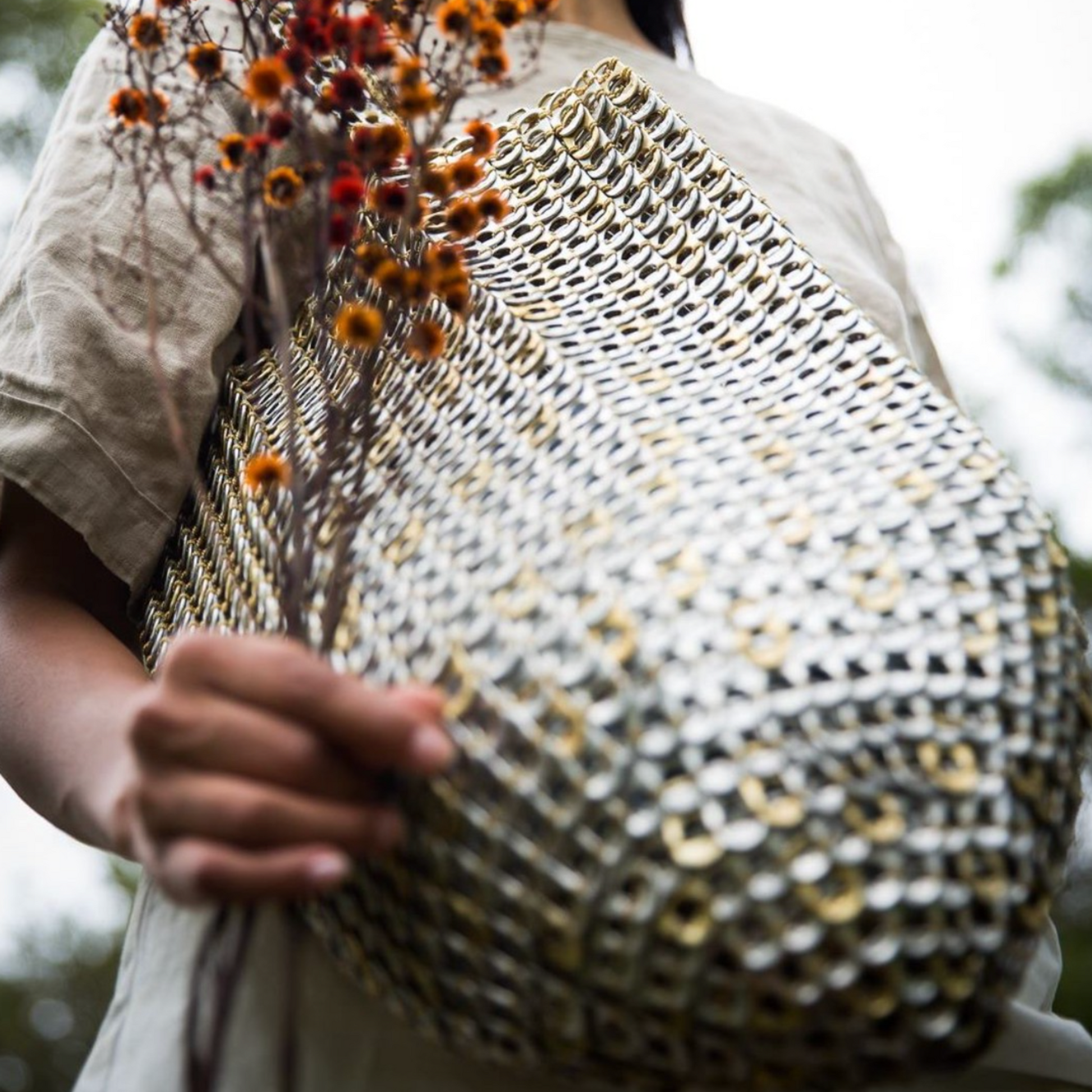Hand-crocheted from individually polished recycled aluminium pull tabs, it has a smooth, flexible texture that feels soft against the body yet offers remarkable strength. Despite its airy feel, this tote confidently holds your everyday essentials and can even fit a laptop, making it both graceful and practical.