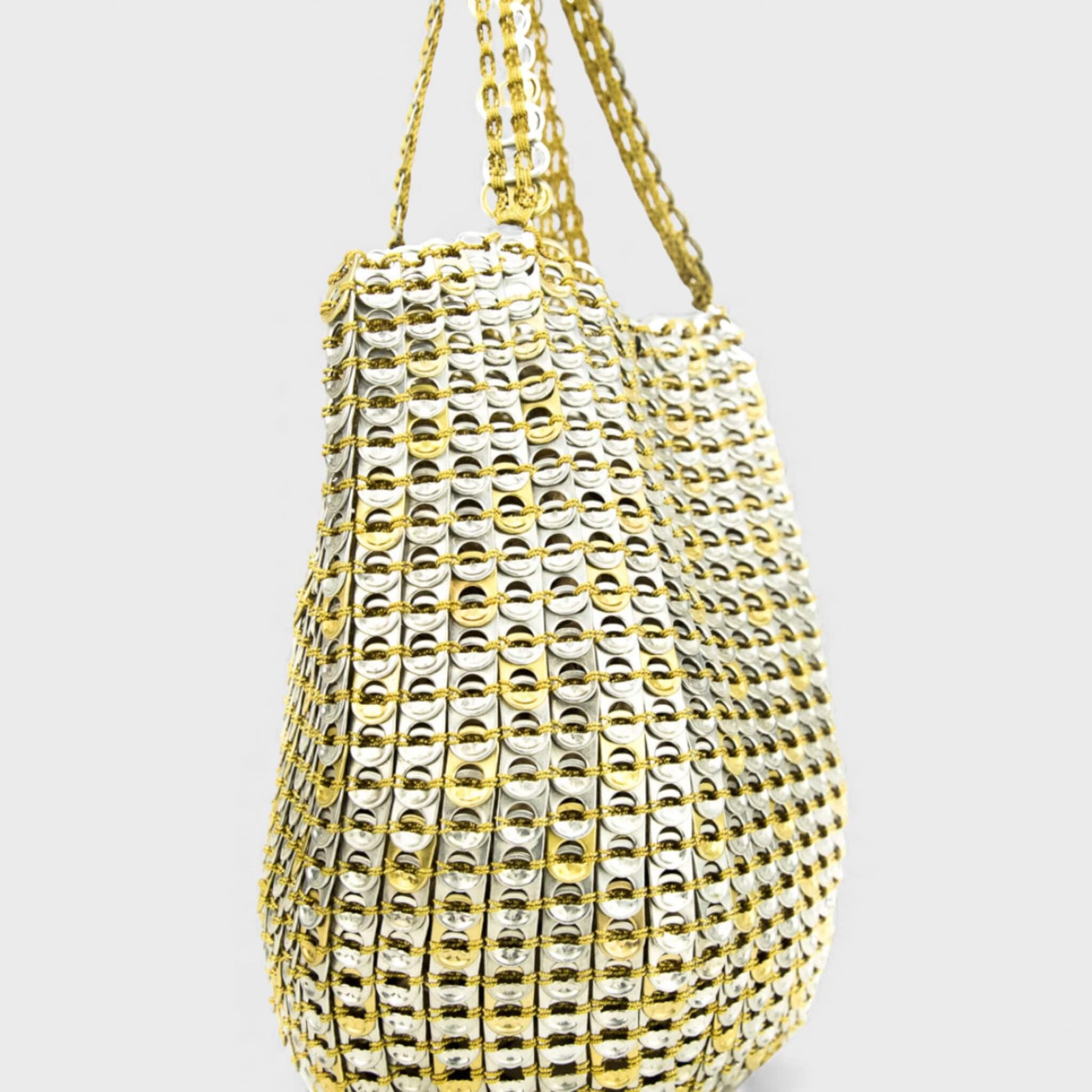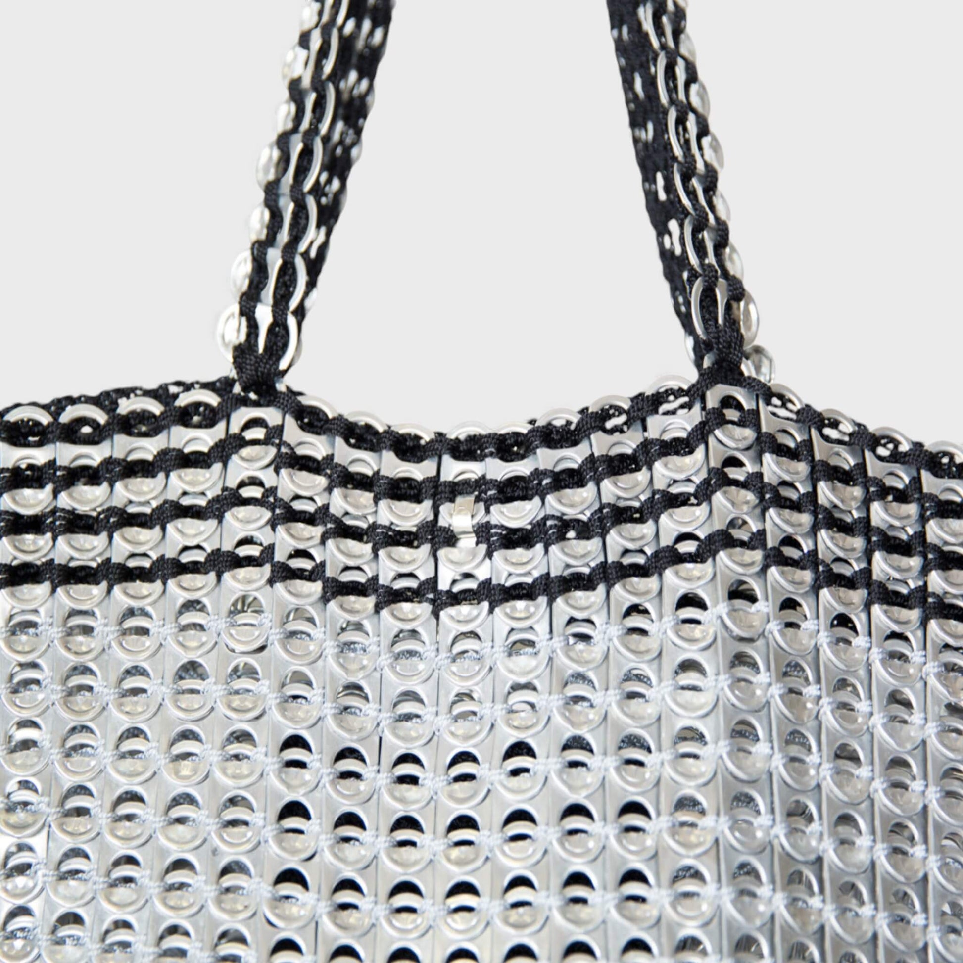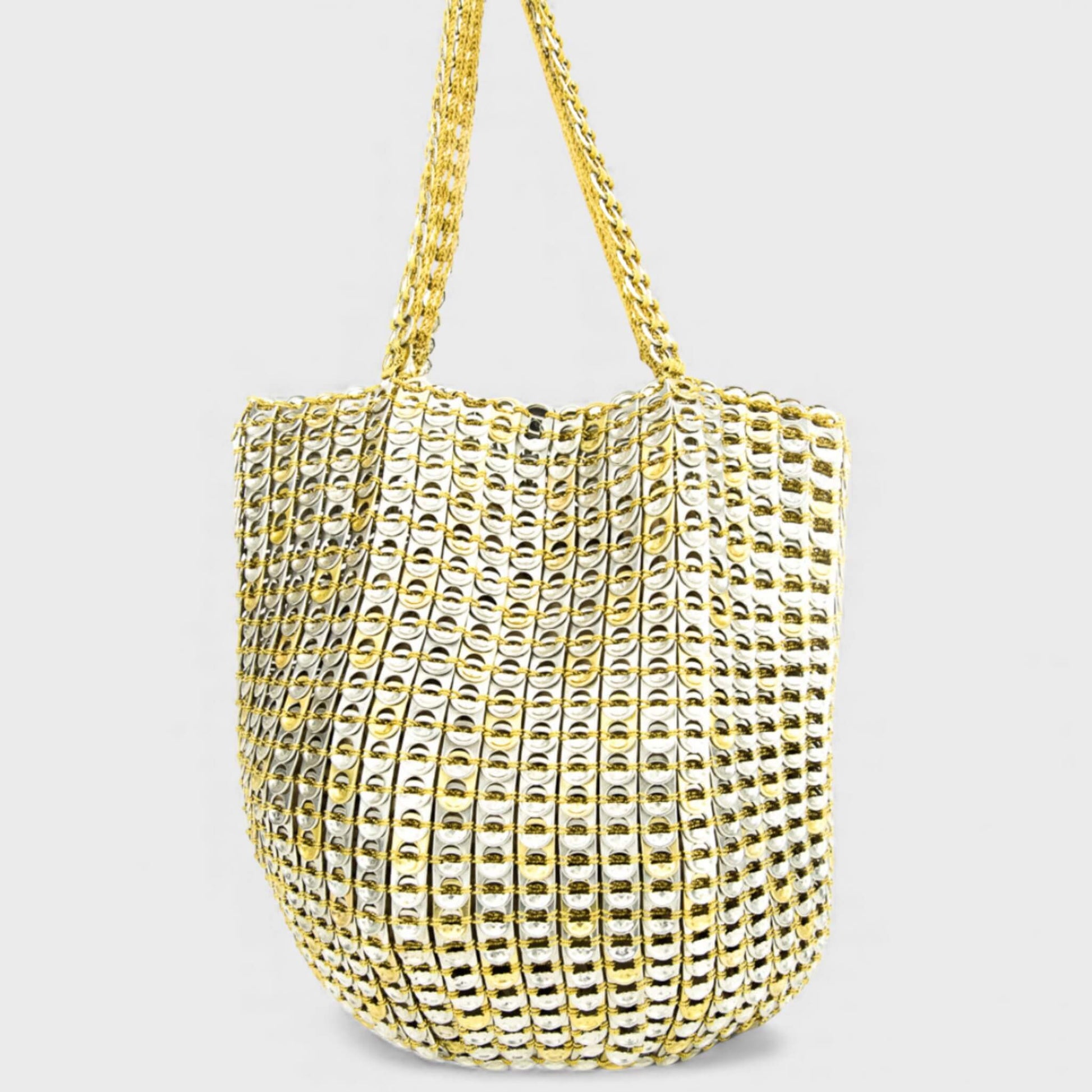 Hand-crocheted from individually polished recycled aluminium pull tabs, it has a smooth, flexible texture that feels soft against the body yet offers remarkable strength. Despite its airy feel, this tote confidently holds your everyday essentials and can even fit a laptop, making it both graceful and practical.