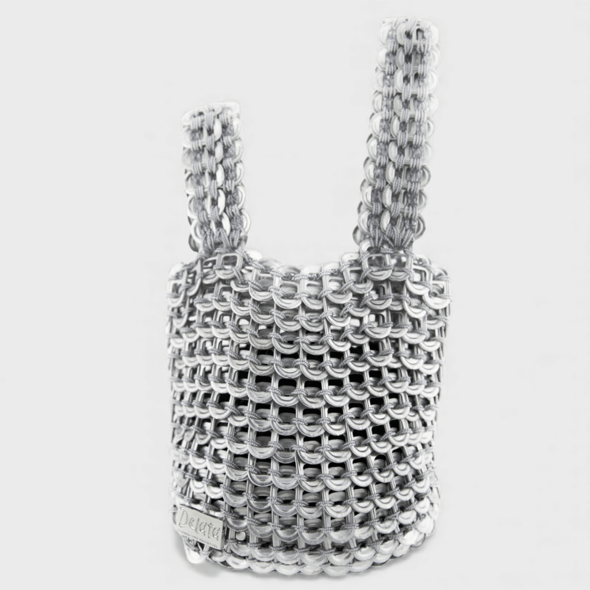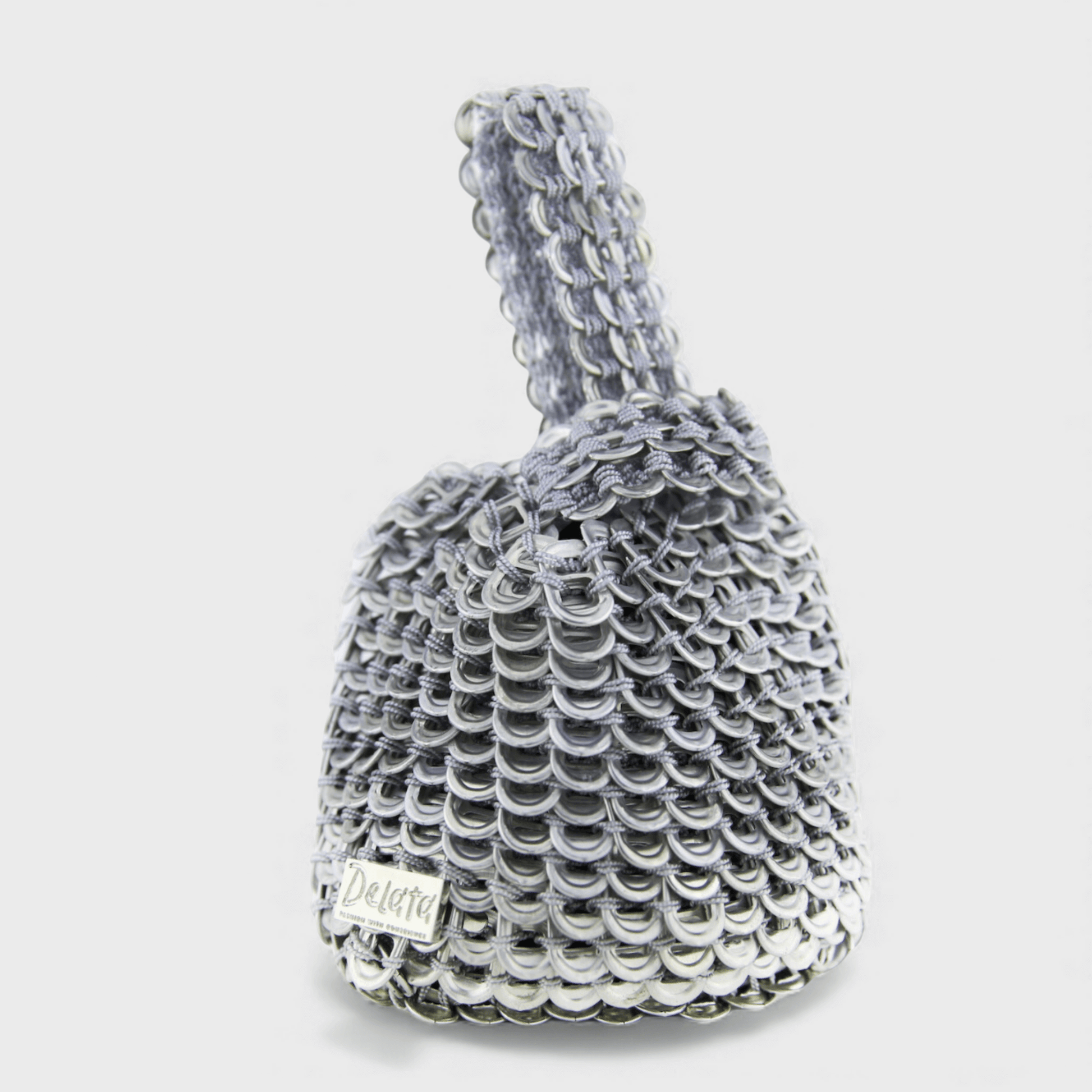 Its signature design features a short strap paired with a longer strap that loops through it, forming a single wrist strap that feels both secure and beautifully sculptural. Handcrafted from recycled aluminium pull tabs that are individually polished and crocheted by skilled artisan mothers in Colombia, it transforms sustainable materials into a smooth, luminous, wearable piece of art.